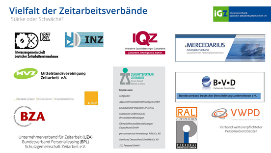 Obwohl die Zeitarbeitsbranche im Vergleich zu anderen Wirtschaftsbereichen kein Riesenfaktor ist, gab es in der AÜG-Geschichte eine auffällige Vielfalt von Verbänden bzw. Interessenvertretungen in Deutschland – beginnend 1969 mit dem Unternehmerverband für Zeitarbeit (UZA), gefolgt von der Gründung des Bundesverbandes Personalleasing (BPL) und der Fusion beider zum Bundesverband Zeitarbeit Dienstleistungen auf Zeit (BZA). Darüber hinaus bildeten sich kleinere Konkurrenzverbände wie die Interessengemeinschaft Nerdbayerischer Zeitarbeitsunternehmen (INZ) und die Schutzgemeinschaft Zeitarbeit (SGZ). Im März 1998 gründete sich die Interessengemeinschaft Deutscher Zeitarbeitsunternehmen (iGZ) anlässlich neuer Gefahrtarife in der VBG mit enormen Beitragssteigerungen in der Branche. Im März 2001 bekam ich als erster hauptamtlicher Hauptgeschäftsführer die Aufgabe, aus den etwa 200 mittelständischen Mitgliedunternehmen einen vollwertigen, schlagkräftigen Arbeitgeberverband zu entwickeln. Der BZA war über diese Konkurrenz-Absichten natürlich „not amused“.